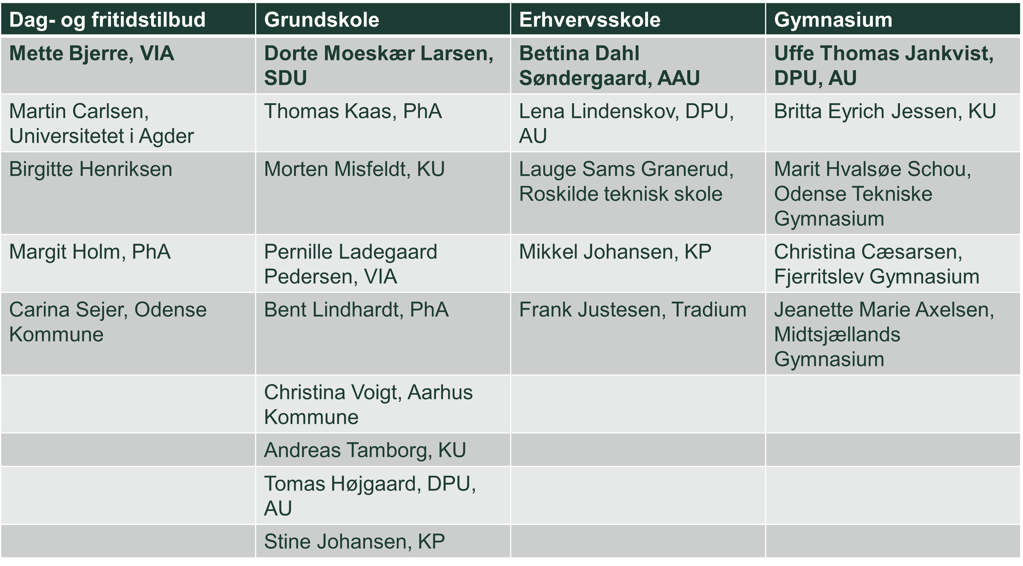 Ekspertgrupperne består hver især af én faglig leder og 4-8 medlemmer fordlet rundt på danske universiteter og profesionshøjskoler.