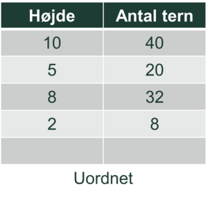 Den ordnede tabel giver også eleverne mulighed for at fokusere på, hvordan tallene i venstre og højre kolonne varierer sammen, dvs. hvordan højden af et rektangel og antallet af tern varierer sammen. Når højden bliver 1 større, bliver antal tern 4 større. Den ordnede tabel giver med andre ord eleverne mulighed for at opdage en samvariation, der gælder generelt.