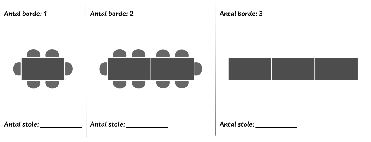 Se på tegningerne. Hvor mange stole passer til 1 bord? 2 borde?
