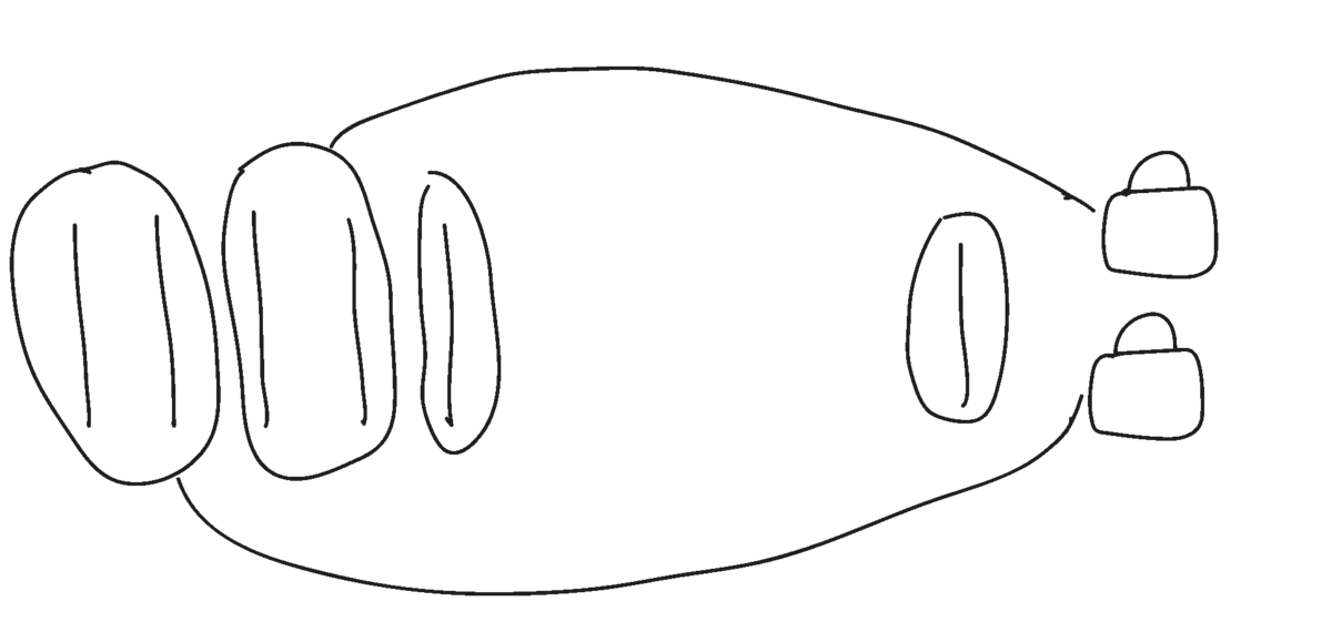 En elev modellerer situationen ved at tegne Eas stænger som $5$ streger og Pers som en streg og to poser (se Figur 2). Eleven kan se, at Pers ene stang ’svarer til’ $1$ af Eas $5$ stænger og tegner en ring om hver af de to. Eleven sammenligner dernæst Pers $2$ poser med Eas $4$ andre stænger og kan se, at stængerne kan fordeles to og to i poserne.