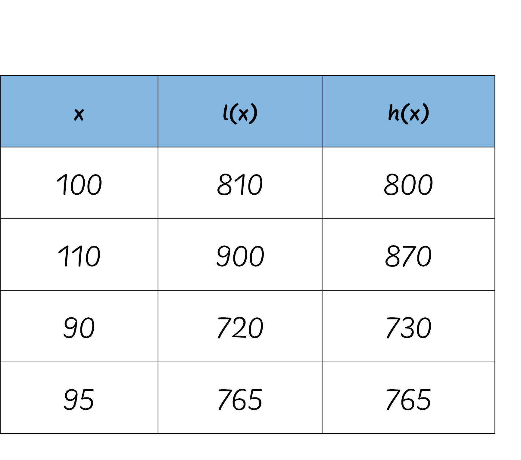 I dette punkt sælger I $95$ lodsedler, og I tjener det samme, uanset om I sælger for velgørenhedsorganisationen eller sportsklubben [peger på skæringspunktet for de to grafer]. I kan finde punktet ved at aflæse dets koordinater, som Ahmed og hans gruppe har gjort, og i GeoGebra kan I aflæse det præcist. Men I kan også bruge de to forskrifter, som vi har fundet. I dette punkt tjener jeres klasse jo lige meget – det vil sige, at værdien af $l(x)$ og $h(x)$ er den samme i dette punkt. Vi kan derfor prøve, om vi kan finde en x-værdi, som gør, at lighedstegnet gælder. Vi ved, at $l(x)$ er $9 \cdot x - 90$, og $h(x)$ er $7 \cdot x + 100$, så den ligning, vi skal løse, er $9 \cdot x - 90 = 7 \cdot x + 100$. Ligner det noget, I tidligere har set? Ja, det ligner de ligninger, som vi arbejdede med sidste år. Hvis vi løser denne ligning – altså finder $x$ – så har vi fundet det antal lodsedler, som klassen skal sælge for at tjene lige meget. Giver det mening? Prøv at løse den.
