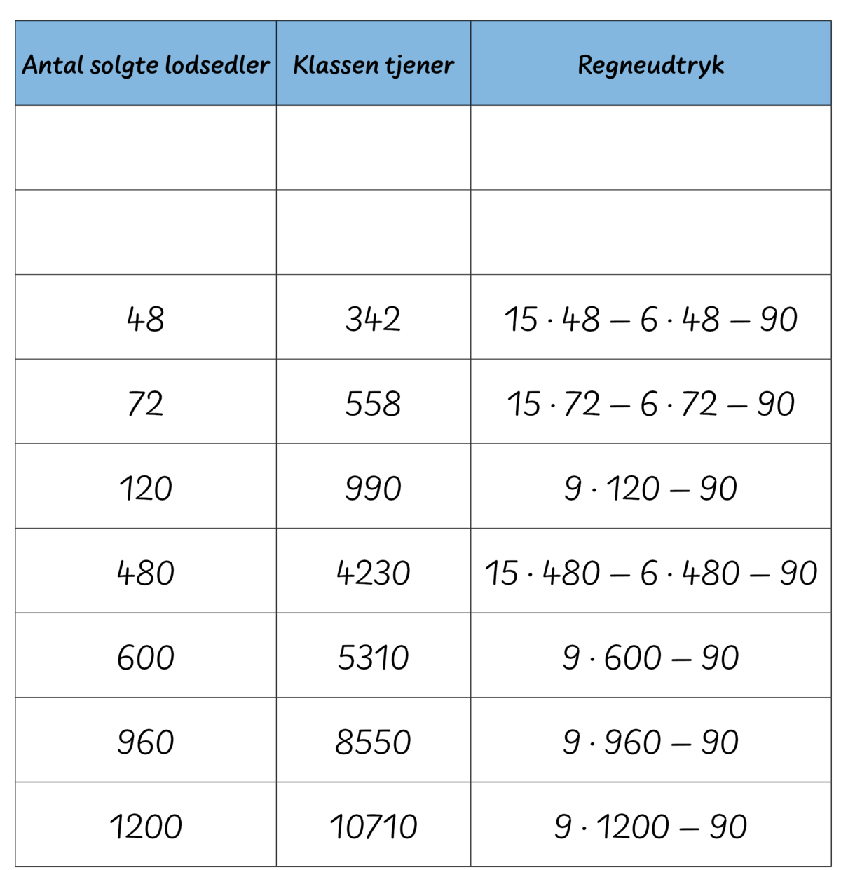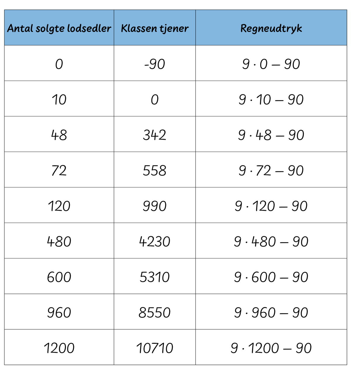 Læreren kan udfordre klassen ved at spørge: ”Hvor mange lodsedler skal I som klasse sælge for at tjene $2250$ kr.? Det er det beløb, vi mangler for at kunne finansiere jeres lejrtur. I skal begrunde jeres svar med en tabel, en graf og med regneudtryk”. Blandt elevernes svar kan læreren med fordel vælge dem ud til en fælles klassesamtale, som har potentiale til at etablere følgende pointer:
