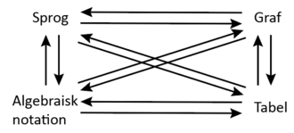 Forskning viser, at disse repræsentationer er essentielle i arbejdet med lineære funktioner og funktioner generelt. Derudover kan eleverne udvikle forståelse af matematiske begreber, når de omskriver (eller manipulerer) inden for en repræsentation – især den algebraiske – og når de oversætter mellem de fire repræsentationer (som vist med pile i Figur 3 til højre).