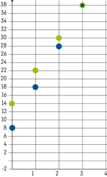 Det er vigtigt, at læreren skaber koblinger mellem forskriften og de andre repræsentationer – tabel og graf – som eleverne brugte i fase 1. Læreren kan fx spørge klassen til betydningen af $8$ og $14$: Hvor kan I se $8$ på grafen? Og $14$? Hvor finder vi $8$ og $14$ i tabellen?