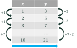 I samvariation er fokus på, hvordan x og y varierer sammen. Man ser på ændringer i $y$, samtidig med at man ser på ændringer i $x$. I Figur 4 vokser $y$ fx med $2$, når $x$ vokser med $1$. Når man ved, hvordan de to variable udvikler sig samtidig, kan man ud fra den værdi, $y$ har, når $x$ er $1$, dvs. $3$ i Figur 4, finde alle funktionsværdierne (Stephens et al., 2017).