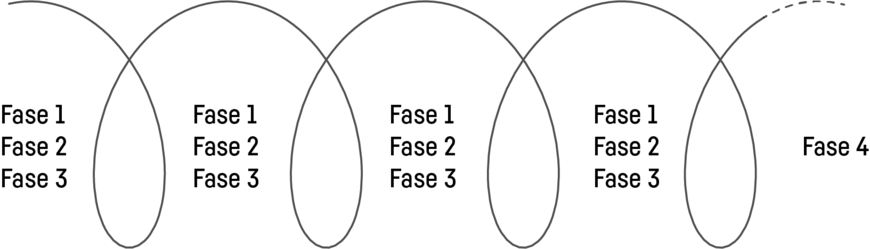 I dette læringsspor lægges der op til, at en klasse gennemløber faserne 1-3 flere gange og først derefter går videre til fase 4. Fase 4 fungerer som en fælles opsamling på klassens foregående arbejde. Dette er illustreret i Figur 2.