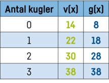 Ud fra den grafiske løsning kan læreren introducere den algebraiske løsning, hvis ingen af eleverne foreslår det. Antal kugler i skæringspunktet kan findes ved at sætte forskrifterne for de to lineære sammenhænge lig med hinanden $v(x)=g(x)$ og løse ligningen $8x + 14 = 10x + 8$. Klassen forventes at have erfaringer med at løse sådanne ligninger (se fx læringssporet ”At løse ligninger”), og læreren kan fokusere på at støtte eleverne i at skabe forbindelse mellem grafen og ligningen. Det er vigtigt, at klassen får mulighed for at skabe sådanne forbindelser i situationer, hvor løsningen af ligningen ikke tager al deres opmærksomhed.