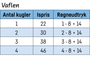 I iskiosken Vaflen skal man betale $8$ kr. for en kugle is og $14$ kr. for en vaffel. I iskiosken Gammeldaws skal man betale $10$ kr. for en kugle is og $8$ kr. for en vaffel. Hvad koster en vaffel med $1$ kugle hos Vaflen? Hos Gammeldaws? Hvad koster en vaffel med $2$, $3$, $4$ eller $n$ kugler?
