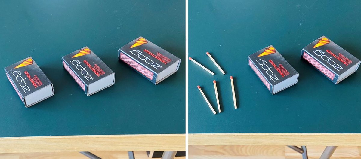 På et bord anbringer hun 2 lukkede tændstikæsker og 5 løse tændstikker. På et andet bord anbringer hun 3 lukkede tændstikæsker. Hun siger: