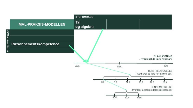 Årsplanlægning af undervisningen handler om at vælge indholdet for undervisningsforløb henover et år, fx. matematikundervisningen i en eller flere klasser på en given årgang, hvor hvert forløb har deres egne læringsmål. At gennemføre kompetenceorienteret årsplanlægning har fokus på, hvilke sider af udvalgte faglige kompetencer, eleverne skal udvikle, og hvordan det på en meningsfuld måde kan spille sammen med stofområderne i 'Fælles Mål'. Det handler mål-praksis-modellens første del om. (Kilde 1 og 2)